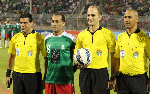 Trọng tài Tumah (cầm bóng) trong một trận đấu tại giải VĐQG Jordan. (Ảnh: Al Wehdat).