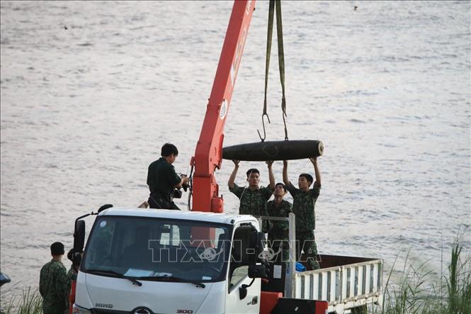 | Quả bom dài khoảng gần 2 mét được các lực lượng công binh đưa vào bờ an toàn. Ảnh: Thành Đạt - TTXVN |