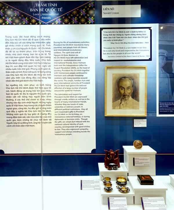 Phần 2: “Thắm tình bạn bè quốc tế” cho khách tham quan thấy được sự ngưỡng mộ, cảm phục và kính trọng Chủ tịch Hồ Chí Minh được thể hiện qua lời nói, hành động và trong trái tim của nhiều bạn bè quốc tế. Dù là nguyên thủ quốc gia, nhân vật nổi tiếng hay người dân bình thường, ở các thể chế chính trị khác nhau nhưng vào dịp sinh nhật Người, những ngày quốc lễ Việt Nam, hay trong các chuyến thăm ngoại giao, công tác, họ đều gửi những món quà đầy ý nghĩa tới Chủ tịch Hồ Chí Minh. Những món quà ấy tuy giản dị nhưng đều mang đậm bản sắc văn hóa dân tộc của mỗi quốc gia, kèm những lời chúc tốt lành tới Người, bày tỏ sự đồng tình, ủng hộ và luôn sát cánh với nhân dân Việt Nam.