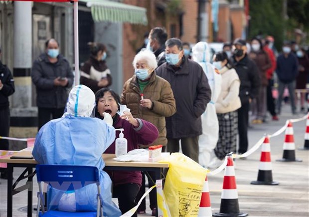 Nhân viên y tế lấy mẫu xét nghiệm COVID-19 cho người dân ở thành phố Thượng Hải, Trung Quốc ngày 1/4/2022. (Ảnh: THX/TTXVN)