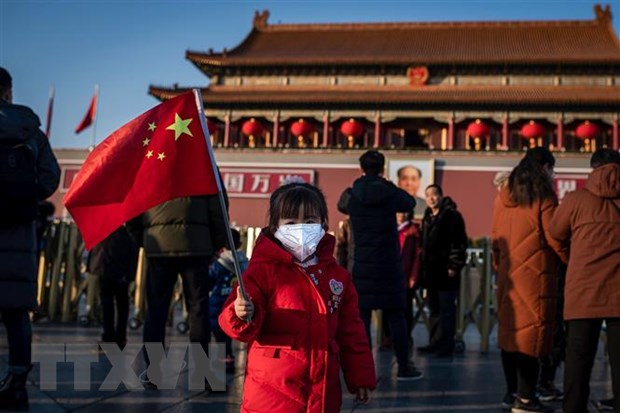 Em nhỏ tại quảng trường Thiên An Môn ở Bắc Kinh, Trung Quốc đeo khẩu trang đề phòng virus corona mới. (Ảnh: AFP/TTXVN)