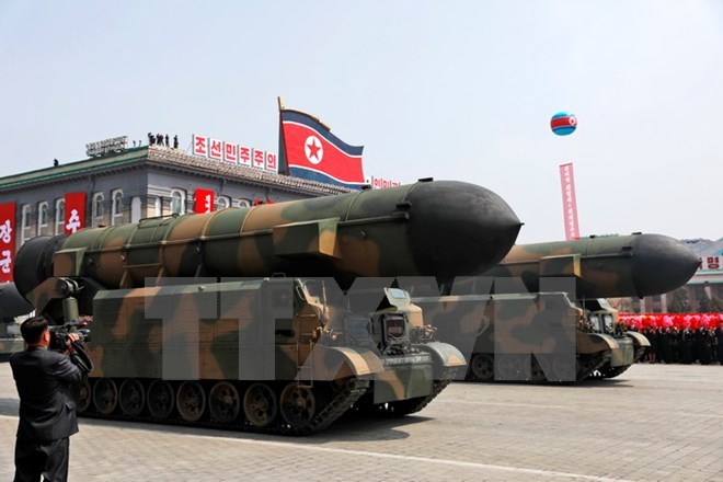 Các tên lửa của Triều Tiên được giới thiệu trong lễ duyệt binh kỷ niệm 105 năm ngày sinh cố Chủ tịch Kim Nhật Thành ở thủ đô Bình Nhưỡng ngày 15/4. (Nguồn: EPA/TTXVN)