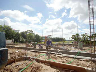 | Công nhân khẩn trương hoàn thành công trình hội trường nhà văn hóa xã theo kế hoạch. |