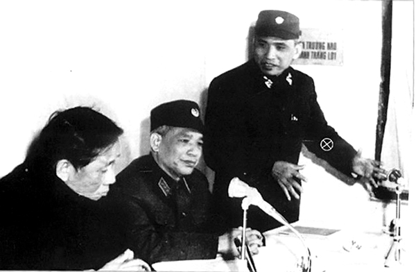 Tư lệnh Lê Văn Tri (đứng) trình bày với Bí thư thứ nhất Lê Duẩn và Tổng tham mưu trưởng Văn Tiến Dũng về kế hoạch tác chiến Chiến dịch "Điện Biên Phủ trên không" ở Hà Nội năm 1972.