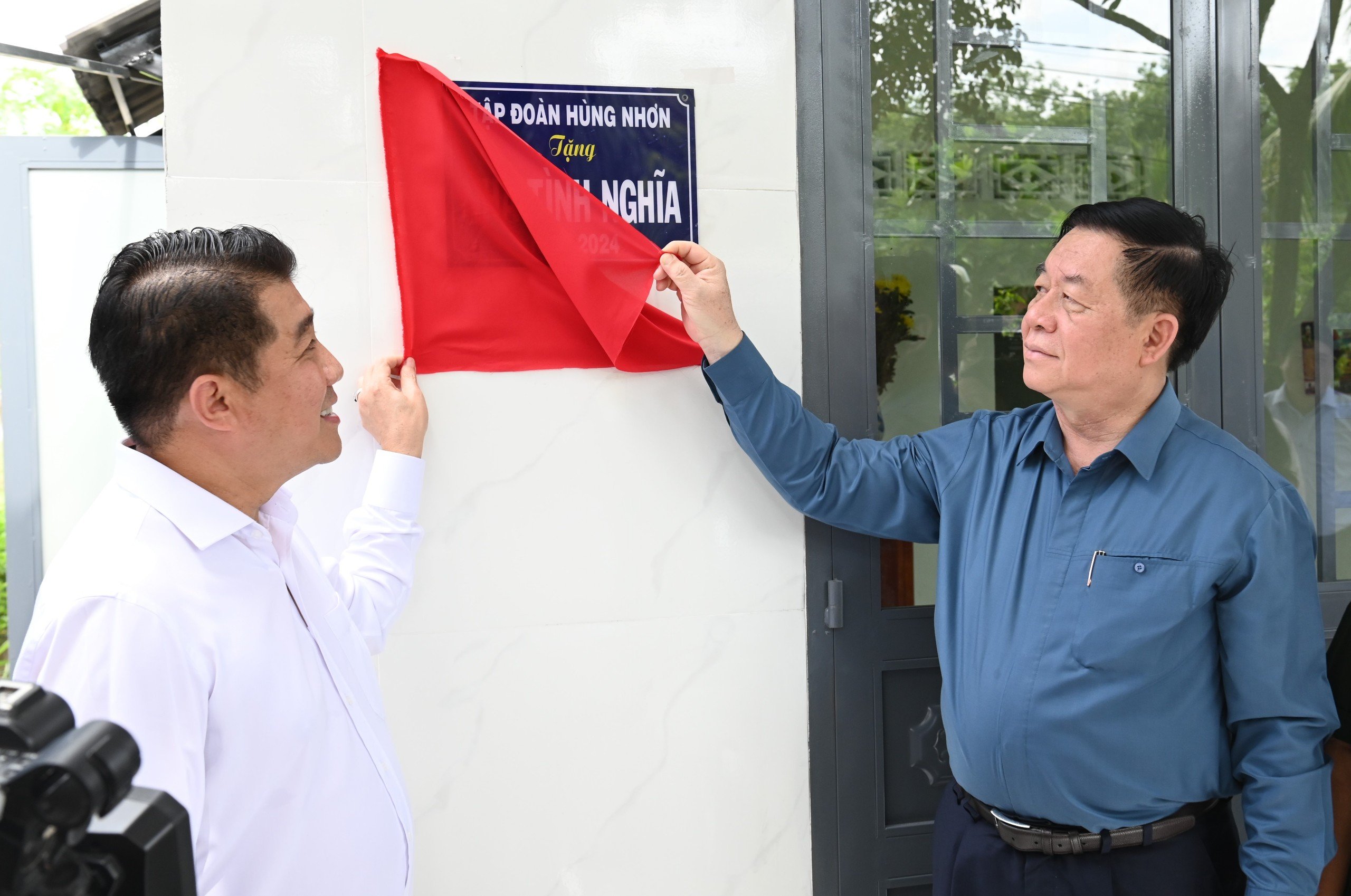| Trưởng Ban Tuyên giáo Trung ương Nguyễn Trọng Nghĩa và ông Vũ Mạnh Hùng mở bảng bàn giao nhà tình nghĩa |