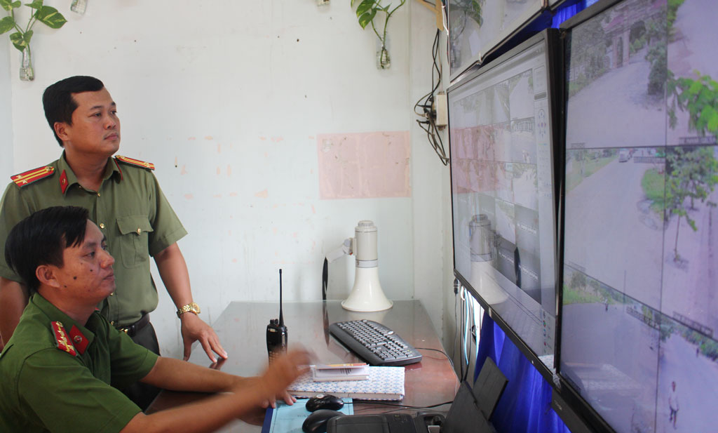 Đại úy Lê Tấn Dư (ngồi) kiểm tra thông tin tội phạm qua camera giám sát an ninh, trật tự