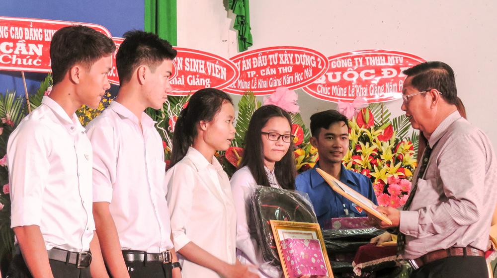 Ông Lê Văn Tâm, Phó Chủ tịch Thường trực UBND TP Cần Thơ khen thưởng cho các tân sinh viên là thủ khoa các ngành tuyển sinh của trường năm 2017.