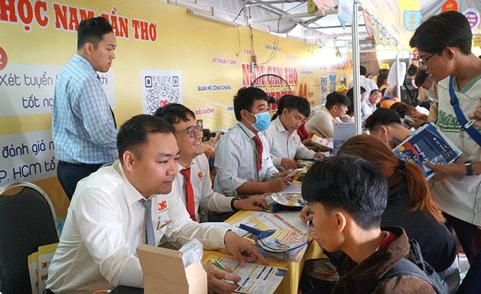Học sinh ở ĐBSCL tìm hiểu thông tin tuyển sinh năm 2024 của Trường ĐH Nam Cần Thơ. Ảnh: B.Ng