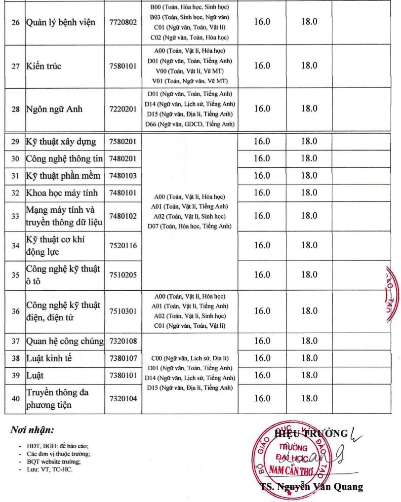 Bảng điểm sàn các phương thức xét tuyển ĐH năm 2024 vào Trường ĐH Nam Cần Thơ.