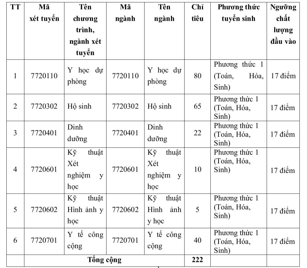 Theo đó, trường tuyển bổ sung 222 chỉ tiêu cho 6 ngành (mời độc giả xem bảng đính kèm); trong đó, ngành Y học dự phòng có chỉ tiêu tuyển nhiều nhất (80 sinh viên), ngành Kỹ thuật Hình ảnh y học có chỉ tiêu tuyển ít nhất (5 sinh viên). Mã tổ hợp môn xét tuyển là B00 (Toán, Hóa, Sinh kết quả thi THPT). Trường tuyển sinh cả nước; xét tuyển kết quả Kỳ thi tốt nghiệp THPT năm 2025 của thí sinh có điểm thi phù hợp với tổ hợp môn xét tuyển của trường và đảm bảo ngưỡng chất lượng đầu vào, điểm xét tuyển không nhân hệ số.