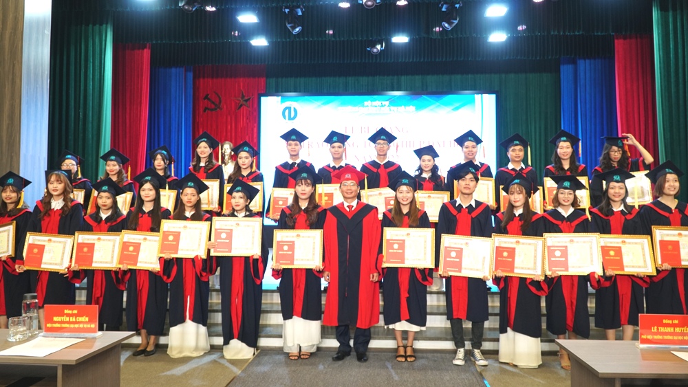 | PGS.TS Nguyễn Bá Chiến, Bí thư Đảng ủy, Hiệu trưởng Nhà trường trao Bằng tốt nghiệp choTân cử nhân. Ảnh: VA |