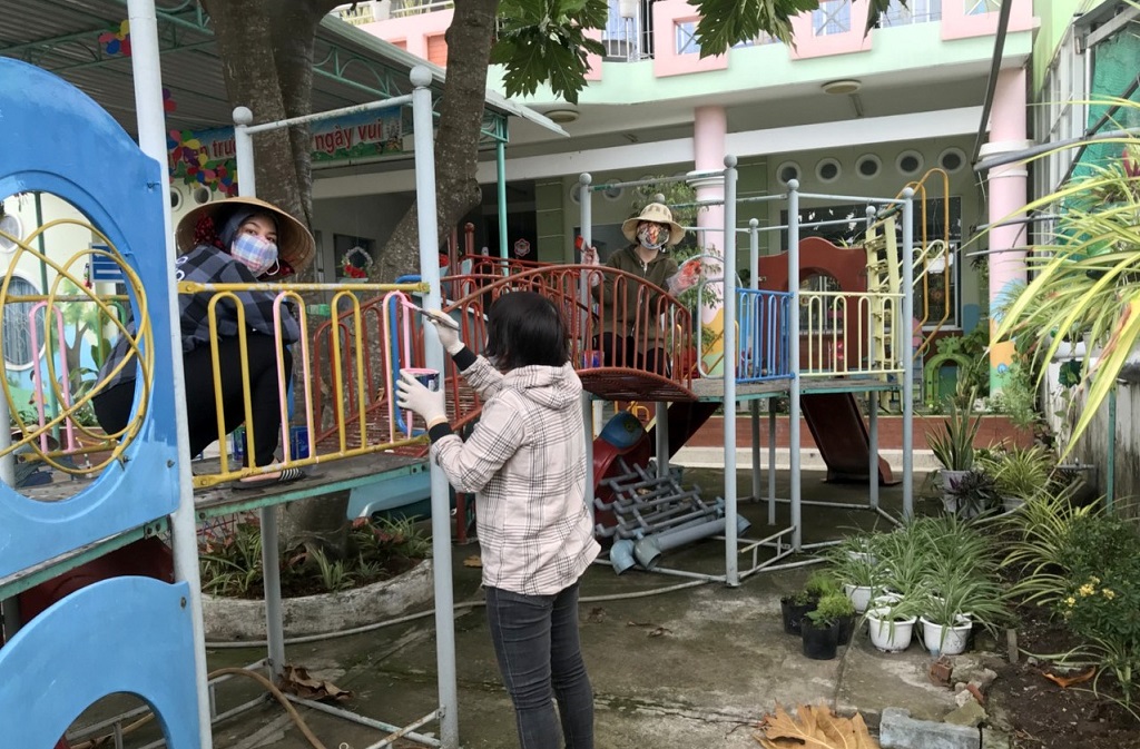 Giáo viên vệ sinh, sơn lại đồ dùng, đồ chơi, chuẩn bị đón trẻ trở lại trường học trực tiếp