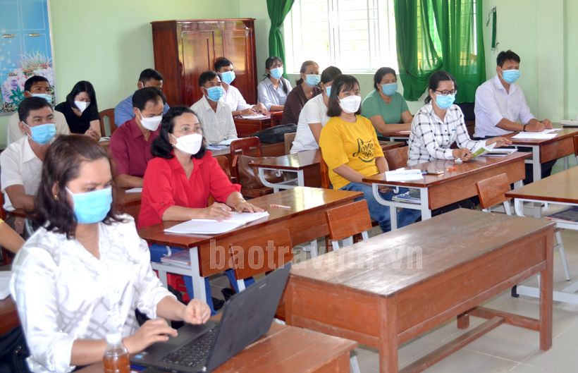 Giáo viên Trường Tiểu học Long Vĩnh C học tập chuyên đề toàn khóa nhiệm kỳ Đại hội XIII của Đảng tại phòng họp trực tuyến của trường.