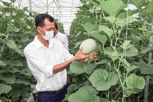 Anh Nguyễn Ðông Thái với mô hình trồng dưa lưới trong nhà kính cho thu nhập cao.
