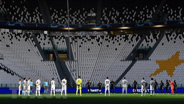 Sân vận động vắng bóng cổ động viên do dịch COVID-19 trong trận đấu giữa câu lạc bộ Juventus và Olympique Lyonnais tại Giải Bóng đá Vô địch các Câu lạc bộ châu Âu UEFA Champions League trên sân vận động Juventus ở Turin, Italy, ngày 7/8/2020. (Ảnh: AFP/ TTXVN)