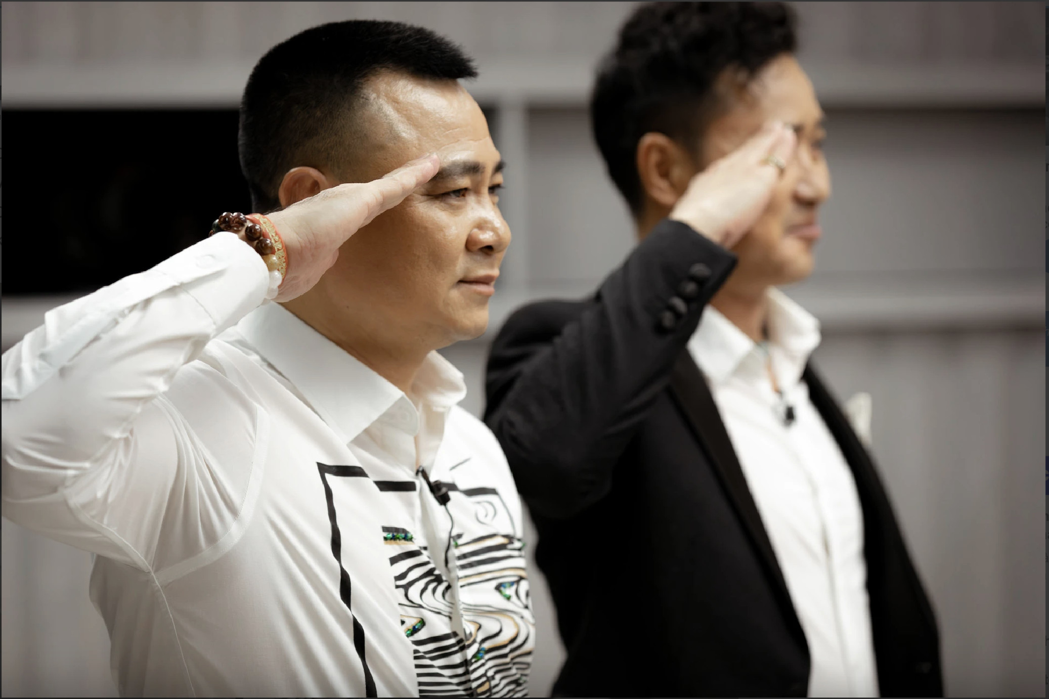 Khoảnh khắc giơ tay chào kiểu nhà binh và bắt nhịp hát Quốc ca cho các bạn trẻ của danh thủ Hồng Sơn, NSND Tự Long mang lại nhiều cảm xúc (Ảnh: Nhà sản xuất cung cấp) |