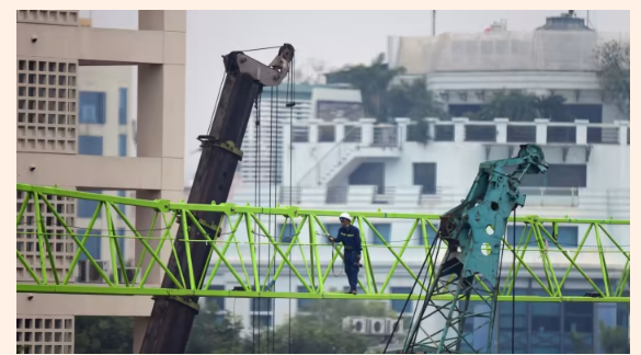 | Bài viết trên tờ Financial Times đăng tải hình ảnh công nhân đang làm việc tại một công trường ở thủ đô Hà Nội. (Ảnh cắt từ bản tin Financial Times) |