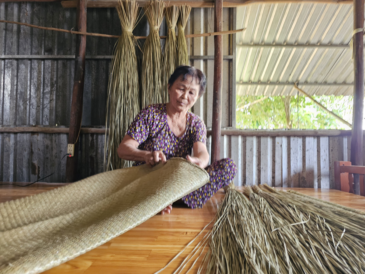 Bà Nguyễn Thị Lên (xã Tân Lập, huyện Mộc Hóa) biết đan bàng từ ngày còn nhỏ và vẫn giữ nghề đến hôm nay