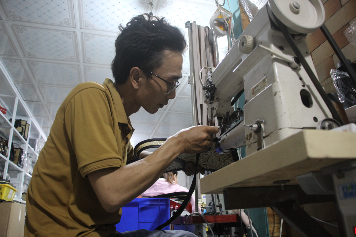 Anh Bùi Thành Được - Giám đốc Công ty TNHH Sản xuất Miền Tây Xanh may thử nghiệm mẫu túi mới