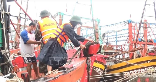 | Các đồn biên phòng tuyến biển tỉnh Quảng Bình hỗ trợ nhân dân chằng chống, neo buộc tàu, thuyền tại các bến, âu thuyền, cảng cá đảm bảo an toàn. Ảnh: Võ Dung/TTXVN |