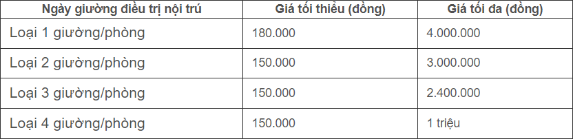 Khung giá ngày giường điều trị theo yêu cầu chưa bao gồm tiền thuốc, các dịch vụ kỹ thuật y tế như sau: