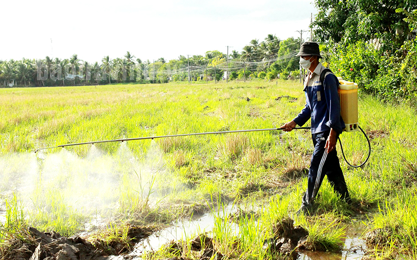 Nông dân Sơn Phi Runl, ấp Đầu Giồng, xã Phương Thạnh phun thuốc diệt cỏ vệ sinh đồng ruộng.