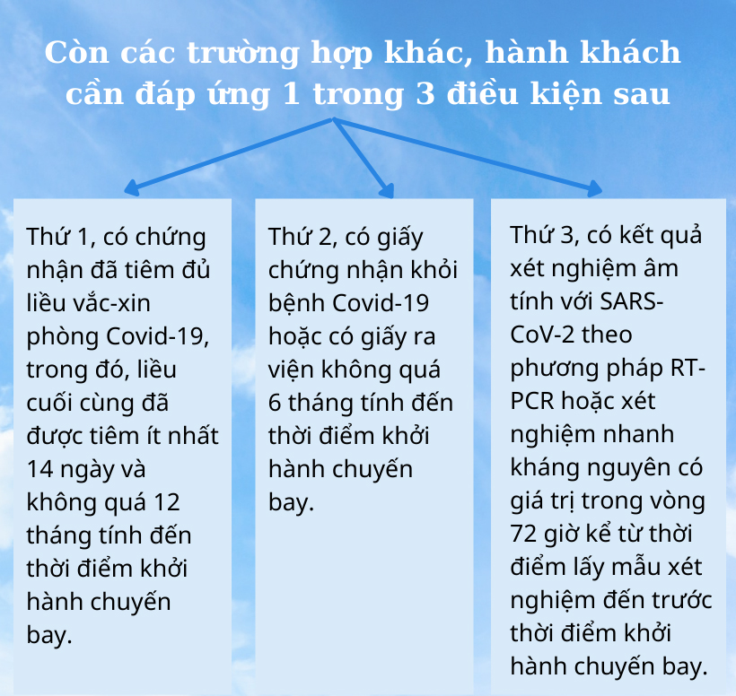 Tại quy định Bộ GTVT cũng nêu các điều kiện đối với hành khách cư trú, lưu trú trước chuyến bay tại địa bàn có dịch ở cấp 4 hoặc cách ly y tế vùng phong tỏa; hoặc hành khách trên chuyến bay xuất phát từ địa bàn có dịch ở cấp 4 hoặc cách ly y tế vùng phong tỏa; hoặc hành khách trên chuyến bay xuất phát từ các Cảng Hàng không quốc tế Tân Sơn Nhất, Cần Thơ phải có kết quả xét nghiệm âm tính với SARS-CoV-2 theo phương pháp RT-PCR hoặc xét nghiệm nhanh kháng nguyên có giá trị trong vòng 72 giờ kể từ thời điểm lấy mẫu xét nghiệm đến trước thời điểm khởi hành chuyến bay.