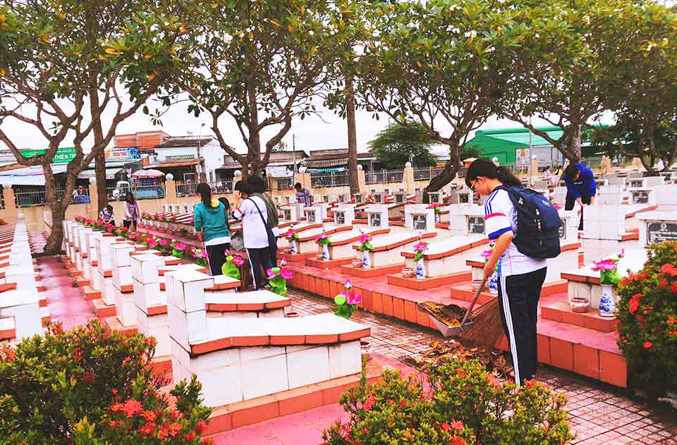 Học sinh Trường THPT Chuyên Long An dọn vệ sinh tại Nghĩa trang Liệt sĩ tỉnh