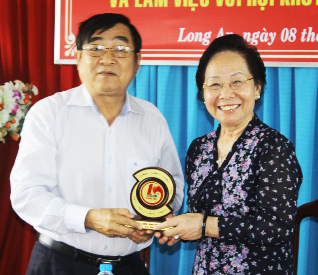 Phó Bí thư Thường trực Tỉnh ủy – Đỗ Hữu Lâm tặng biểu tượng Long An cho nguyên Phó Chủ tịch nước, Chủ tịch Hội Khuyến học Việt Nam - Giáo sư, Tiến sĩ Nguyễn Thị Doan