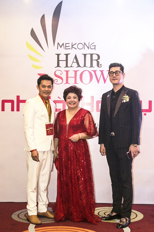 Nhà tạo mẫu Nguyễn Luân, bà Jessica Liễu (từ trái sang) tại chương trình “Mekong Hair Show- Anh tài hội tụ”. Ảnh: DUY LỮ