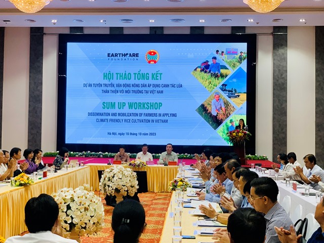 Phát biểu tại Hội thảo, đồng chí Lương Quốc Đoàn, Uỷ viên TW Đảng, Chủ tịch Trung ương Hội Nông dân Việt Nam nhấn mạnh, là tổ chức chính trị - xã hội của giai cấp nông dân, là trung tâm nòng cốt của các phong trào nông dân và xây dựng nông thôn mới, Hội Nông dân Việt Nam đã ban hành nhiều nội dung, xây dựng cụ thể hoá nhiều chương trình, thể hiện rõ vai trò cùng cả hệ thống chính trị tham gia, chủ động ứng phó và thích ứng với các kịch bản biến đổi khí hậu. Một trong những hoạt động đó, Ban Thường vụ Trung ương Hội Nông dân Việt Nam đã giao Ban Đối ngoại và Hợp tác quốc tế triển khai thực hiện dự án “Tuyên truyền, vận động nông dân áp dụng canh tác lúa thân thiện với môi trường tại Việt Nam” với sự tài trợ của tổ chức EarthCare Foundation nhằm phát triển một nền nông nghiệp xanh, bền vững, góp phần giảm thiểu phát thải khí nhà kính trong sản xuất nông nghiệp, thích ứng với biến đổi khí hậu.