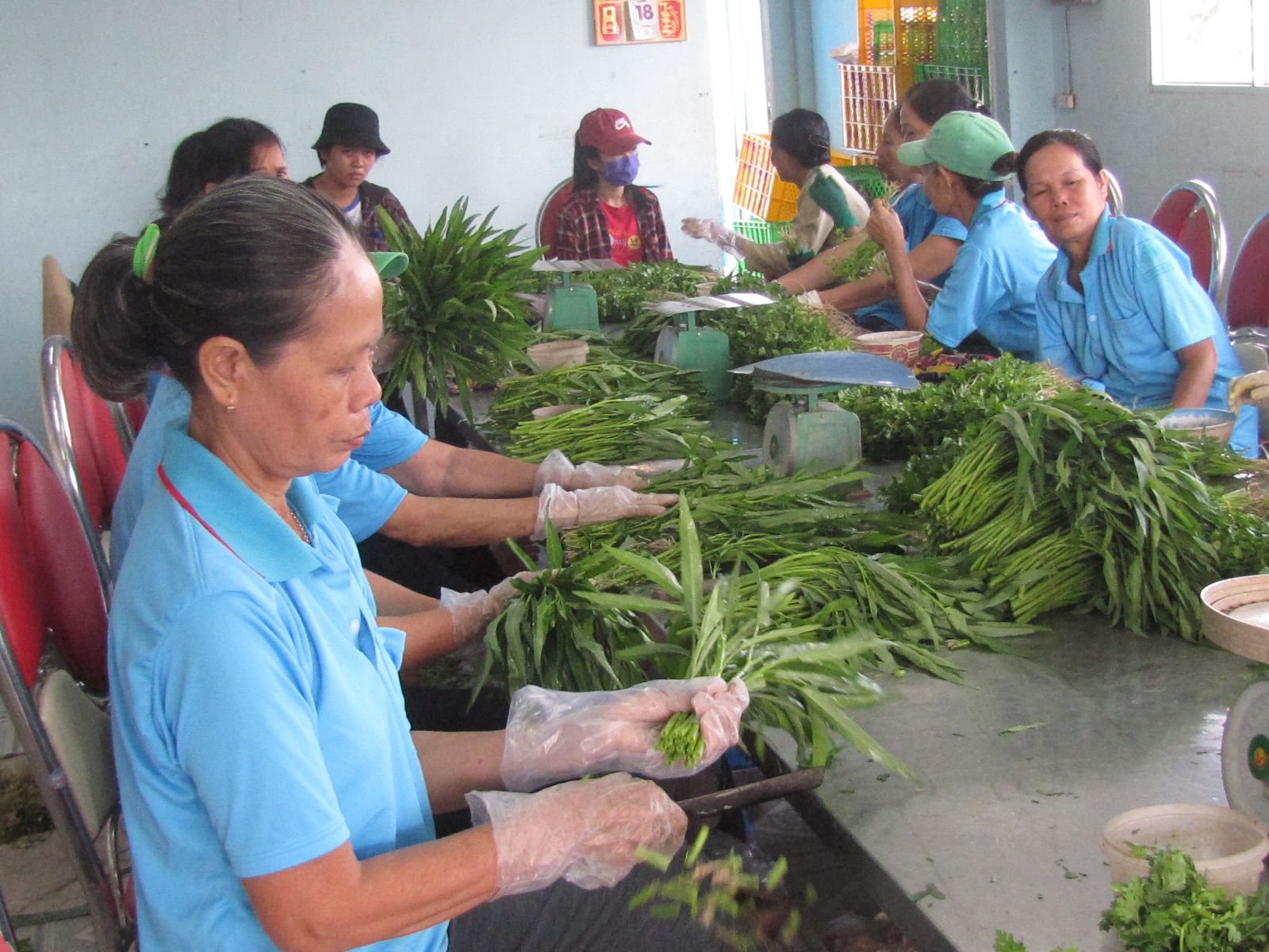 Sơ chế rau trước khi đóng gói sản phẩm tại Hợp tác xã Rau an toàn Phước Hòa, xã Phước Vân, huyện Cần Đước, tỉnh Long An