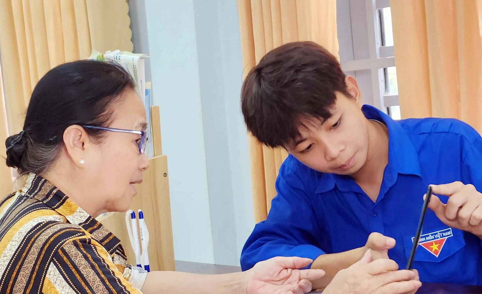| Thanh niên xã Thanh Phú (thị xã Bình Long) hỗ trợ người dân quét mã QR đăng ký tài khoản dịch vụ công tại bộ phận một cửa. (Ảnh: Ngọc Quế) |