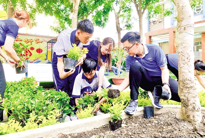 Quận đoàn Ninh Kiều trồng cây xanh, hoa kiểng tại Trường Tương Lai, góp phần xây dựng trường học xanh - sạch - đẹp.