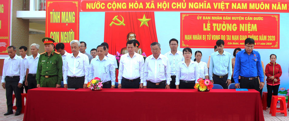 Lãnh đạo huyện, đại diện các ngành, đoàn thể huyện Cần Đước dành phút tưởng niệm nạn nhân tử vong do tai nạn giao thông năm 2020. Ảnh: Tú Phong