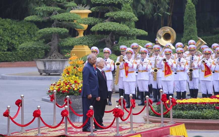 40. Tổng thống Cộng hòa Ấn Độ Ram Nát Cô-vin cảm ơn Chủ tịch nước Nguyễn Phú Trọng và người dân Việt Nam thân thiện về sự đón tiếp nồng hậu và trân trọng mời Chủ tịch nước Nguyễn Phú Trọng thăm Ấn Độ trong thời gian tới. Chủ tịch nước Nguyễn Phú Trọng vui vẻ nhận lời và nhất trí thời gian chuyến thăm sẽ được thu xếp qua đường ngoại giao.