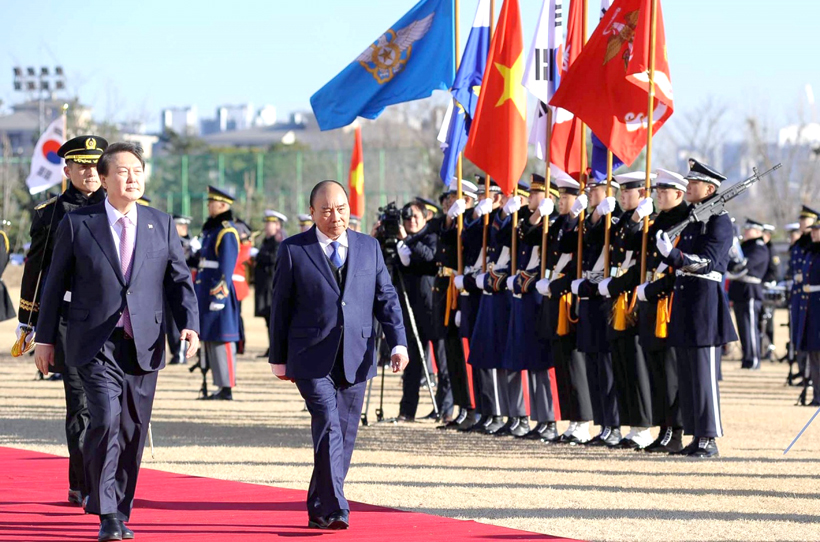 Chiều 05/12, tại Văn phòng Tổng thống Hàn Quốc, Tổng thống Yoon Suk Yeol chủ trì lễ đón trọng thể Chủ tịch nước Nguyễn Xuân Phúc theo nghi thức cao nhất.