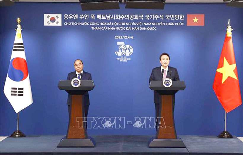 Nhận lời mời của Tổng thống Đại Hàn Dân Quốc Yoon Suk-yeol, Chủ tịch nước Cộng hòa xã hội chủ nghĩa Việt Nam Nguyễn Xuân Phúc đã thăm cấp Nhà nước Đại Hàn Dân Quốc từ ngày 04 - 06/12/2022. Trong chuyến thăm, Chủ tịch nước Nguyễn Xuân Phúc đã hội đàm với Tổng thống Yoon Suk Yeol và hội kiến với các lãnh đạo cấp cao của Hàn Quốc. Lãnh đạo cấp cao hai nước đánh giá cao quan hệ hai nước đã phát triển nhanh chóng, hiệu quả trong 30 năm qua, nhất là từ khi thiết lập quan hệ “Đối tác hợp tác chiến lược” năm 2009, trao đổi ý kiến sâu rộng về phương hướng phát triển quan hệ thời gian tới và về các vấn đề khu vực, quốc tế cùng quan tâm.