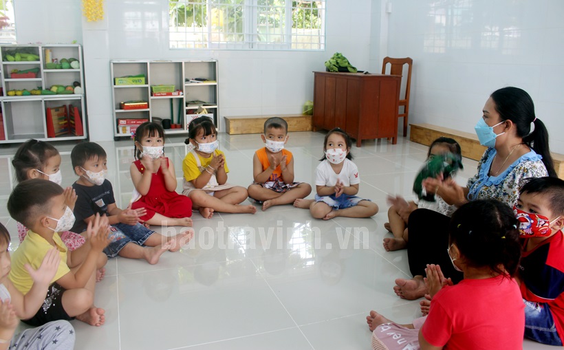 Các bé Trường Mầm non thị trấn Tiểu Cần phấn khởi cùng cô tham gia hoạt động tại lớp. Ảnh: TL