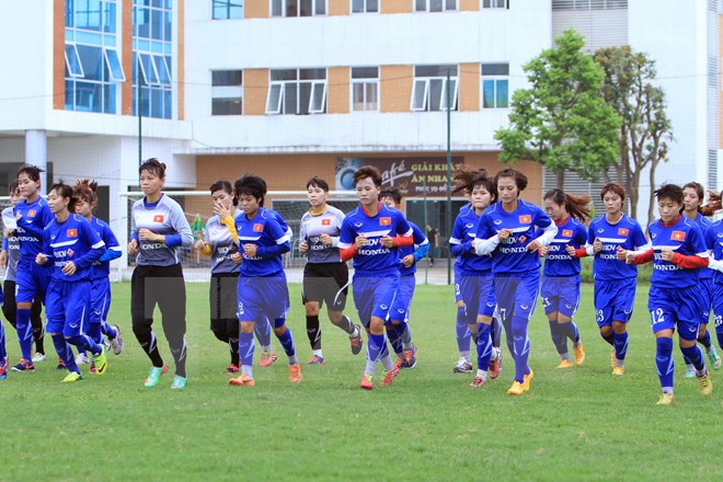 Đội tuyển bóng đá nữ Quốc gia tập trung huấn luyện chuẩn bị cho vòng loại Olympic 2016, tháng 9/2015. (Ảnh: Quốc Khánh/TTXVN)