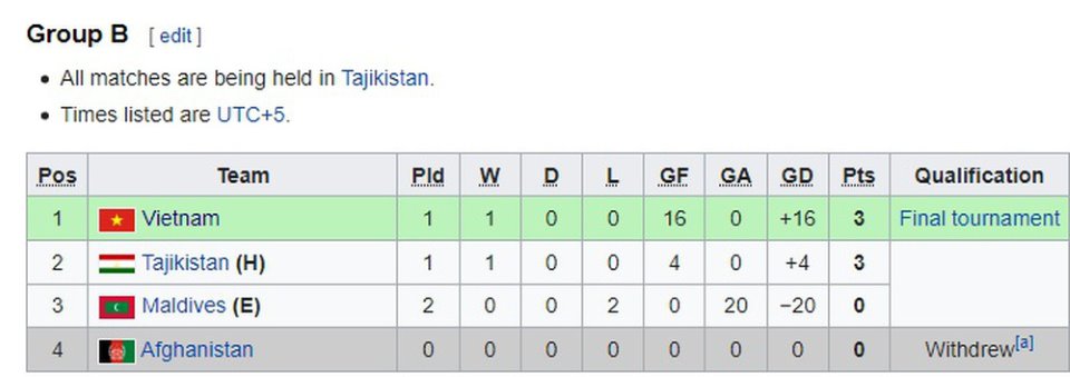 Với việc chỉ ghi được 4 bàn vào lưới Maldives, Tajikistan chỉ xếp thứ hai tại bảng B, vòng loại Asian Cup 2022, xếp dưới tuyển Việt Nam.