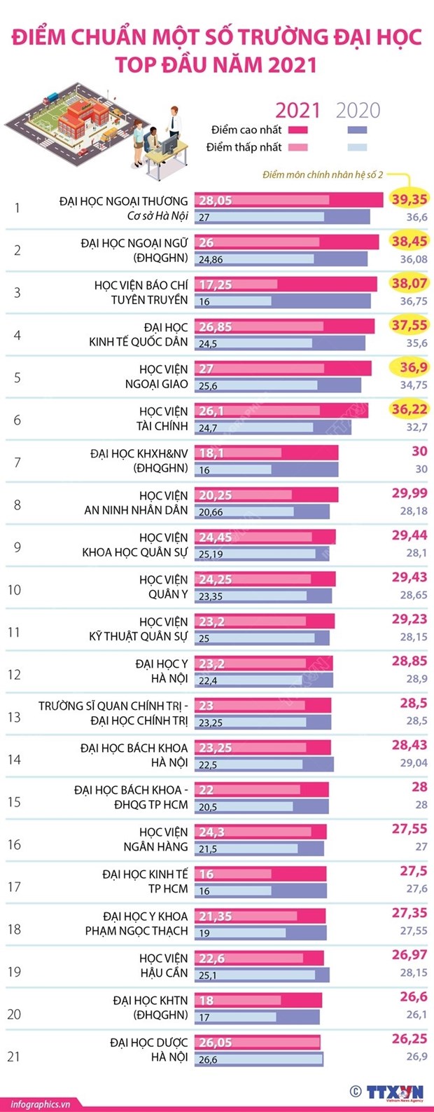 Điểm sàn nộp hồ sơ vào 6 ngành do trường cấp bằng từ 20-21,5 điểm; với 22 ngành đào tạo liên kết nước ngoài, điểm nhận hồ sơ từ 15-18 điểm.