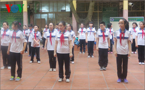 Học sinh lớp 6 ở một trường THCS tại Hà Nội trong giờ Thể dục