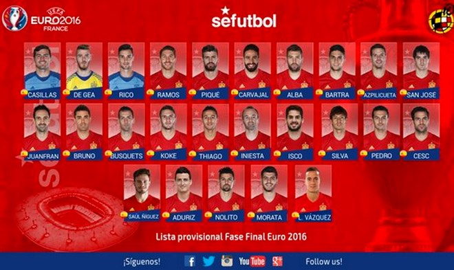 Huấn luyện viên Vicente del Bosque vừa công bố danh sách 25 tuyển thủ Tây Ban Nha chuẩn bị cho vòng chung kết EURO 2016.