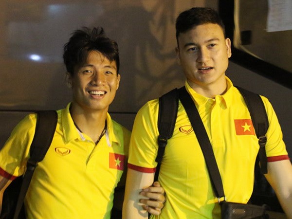 Đặng Văn Lâm (phải) và đồng đội Bùi Tiến Dũng tươi cười sau chuyến hành trình từ Nội Bài. (Ảnh: VFF)