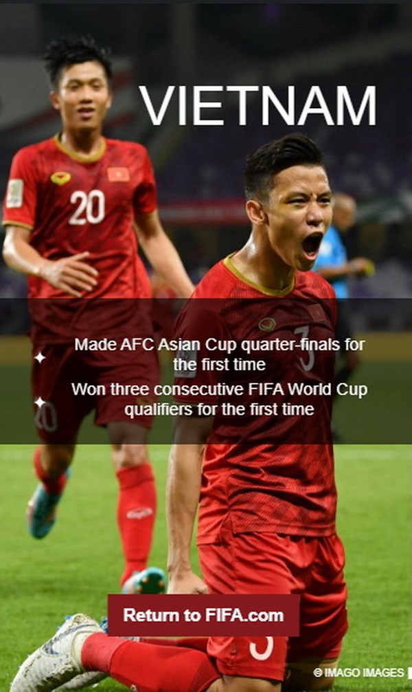 FIFA ấn tượng với thành tích lần đầu tiên lọt vào tứ kết Asian Cup và thắng ba trận liên tiếp ở vòng loại World Cup 2022 của thầy trò huấn luyện viên Park Hang-seo.