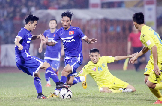 Văn Toàn (trái) trong pha tấn công của tuyển Việt Nam trước Hà Nội T&T Ảnh: HẢI ANH