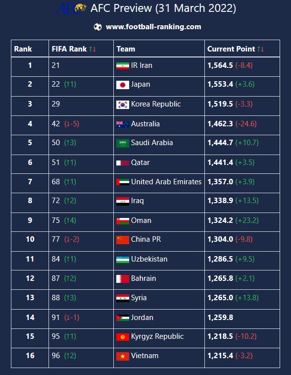 Trận hòa trước tuyển Việt Nam khiến Nhật Bản đánh mất ngôi số một châu Á vào tay Iran. Họ đứng hạng 22 thế giới với 1.553,45 điểm, trong khi Iran xếp hạng 21 với 1.564,49 điểm.
