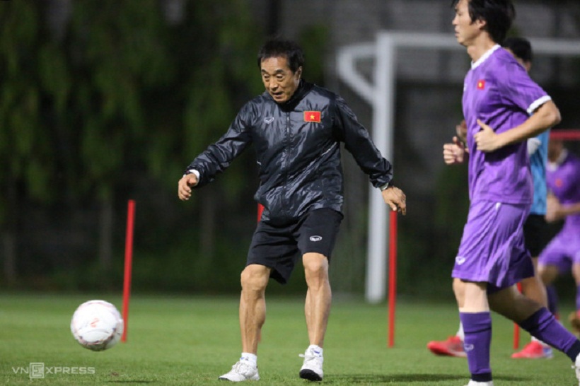 Trợ lý Lee Young-jin chỉ đạo các cầu thủ tập luyện trong buổi đầu tại Thái Lan hôm 14/01.