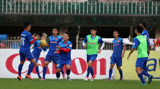 Các tuyển thủ VN tronjg buổi tập chiếu tối 15/11. Ảnh: TUẤN MINH